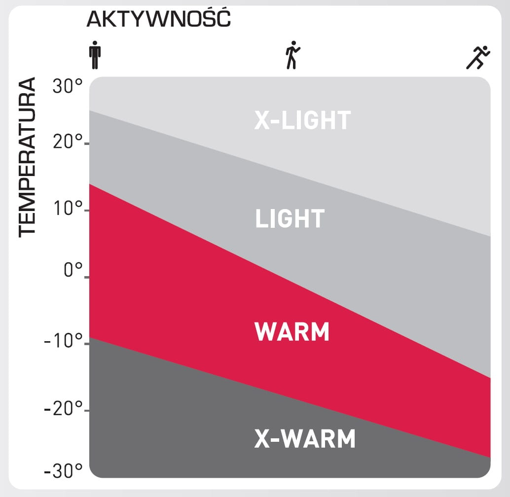 - WARM - Doskonała izolacja cieplna. Bardzo dobre odprowadzanie wilgoci. Utrzymuje skórę ciepłą i suchą. Właściwa dla wszystkich rodzajów aktywności w niższych temperaturach.